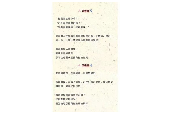 天秤座并不排斥小情話,而是將其視為生活中不可或缺的一部分。他們喜歡那些真誠、自然且富有創(chuàng)意的話語,能夠通過小情話感受到被關愛和被重視。同時,天秤座也會用自己的方式去回應和表達愛意,與伴侶建立起深厚而穩(wěn)定的感情。在愛情的世界里,天秤座就像那座優(yōu)雅的天秤,平衡著情感的天平,用小情話和行動共同書寫著屬于他們的浪漫故事。